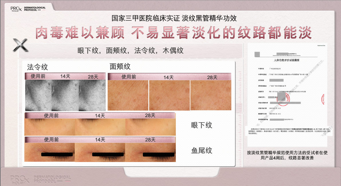 科学配方的核心价值,在于可验证的实际功效。今年,OLAY PROX实验室线以实际行动诠释了这一理念,联合权威三甲医院进行了严苛的临床实证。针对难以通过光电治疗的顽固斑点问题(如:黄褐斑),以及肉毒项目难以全面兼顾的纹路部位(如法令纹、眼下纹、面颊纹、木偶纹),在使用了第4代淡斑小白瓶1+1和第2代淡纹黑管精华28天后都有肉眼可见的显著改善。并且在产品试用期间,未出现1例1级或以上皮肤不良反应,这表明试验产品具有良好的安全性,真正做到了安全与功效的完美平衡。
