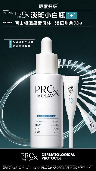 OLAY PROX实验室线此次焕新,"淡斑小白瓶+传明酸冷凝胶"1+1,采用"进阶式淡斑"形式日常全脸护理,局部斑点处叠加强化,确保不同成因的色斑都能够最大程度有效。